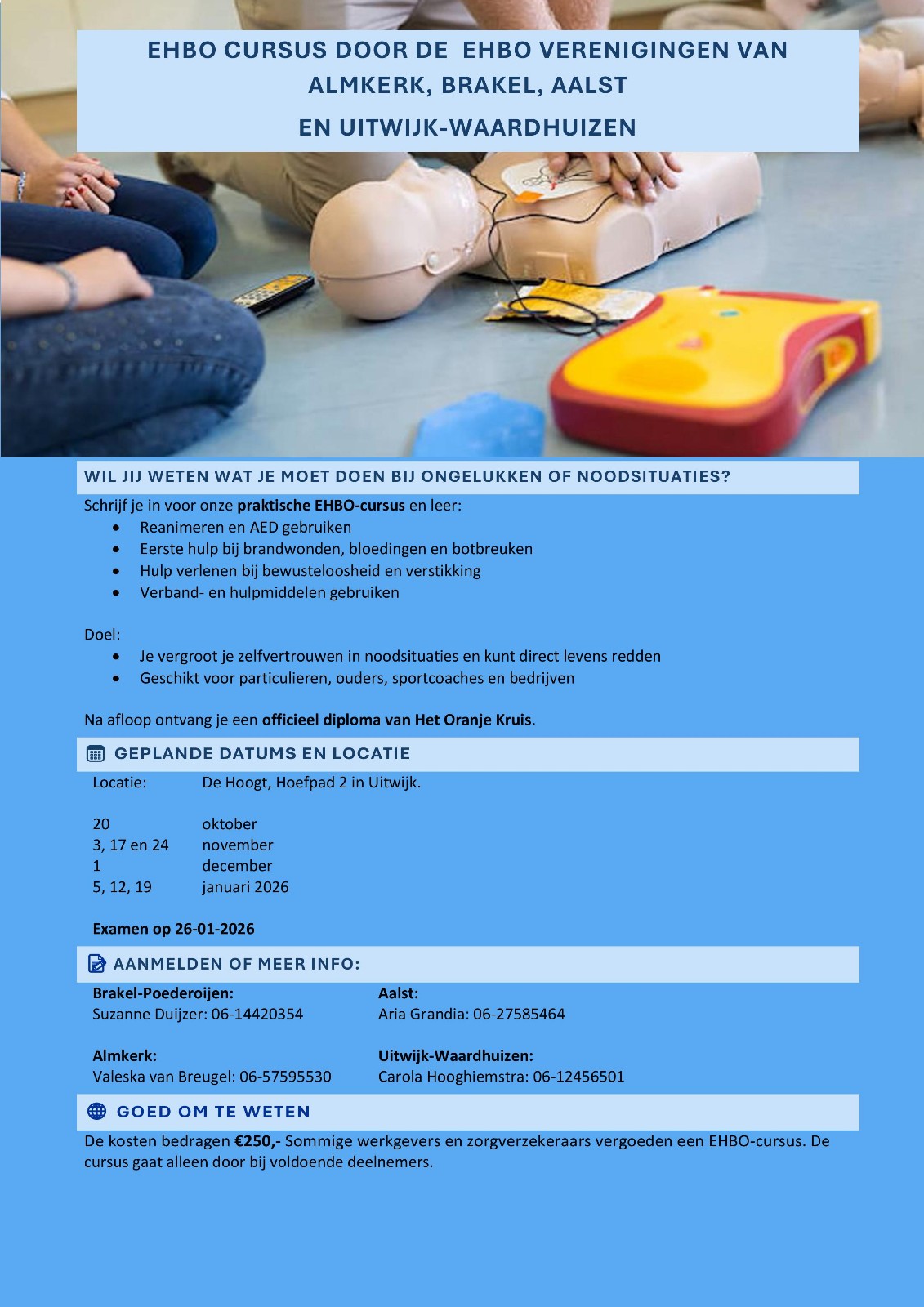 Samen met de EHBO vereniging Almkerk en Brakel heeft de EHBO vereniging Uitwijk-Waardhuizen een cursus georganiseerd. Afgelopen donderdag was een oefenexamen waar veel leden aanwezig waren om te ondersteunen.